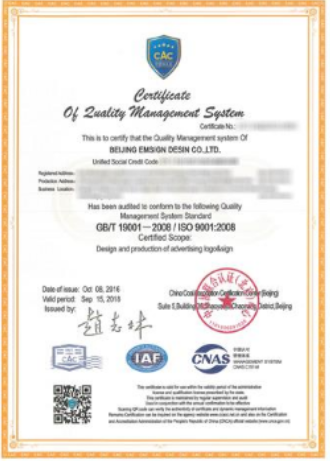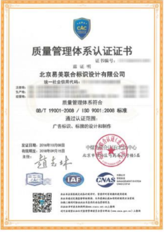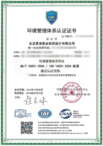 北京易美聯合標識設計有限公司擁有一支朝氣蓬勃,技術過硬且創(chuàng)新敬業(yè)的新生代高素質人才隊伍,依靠良好的信譽與技術優(yōu)勢 ,取得了用戶的一致好評,以及同行業(yè)的共同認可。依托戰(zhàn)略國際全球領先的專業(yè)技術和營運經驗。時刻謹記以誠信之心取信于社會、以誠實之為取信于市場、以誠懇之情取信于客戶、以誠摯之行取信于同仁,深知人才、誠信、創(chuàng)新對企業(yè)的重要性。公司堅持以科學發(fā)展觀統(tǒng)攬全局,實施 以人才為根本、以市場為導向、以效益為核心、以創(chuàng)新為動力、以專業(yè)樹品牌的發(fā)展戰(zhàn)略,堅定地走快速、協調、持續(xù)、健康的發(fā)展之路。 該企業(yè)順利通過GB/T 19001-2008/ISO9001:2008認證 該企業(yè)順利通過GB/T 24001-2004/ISO14001:2004認證 |
